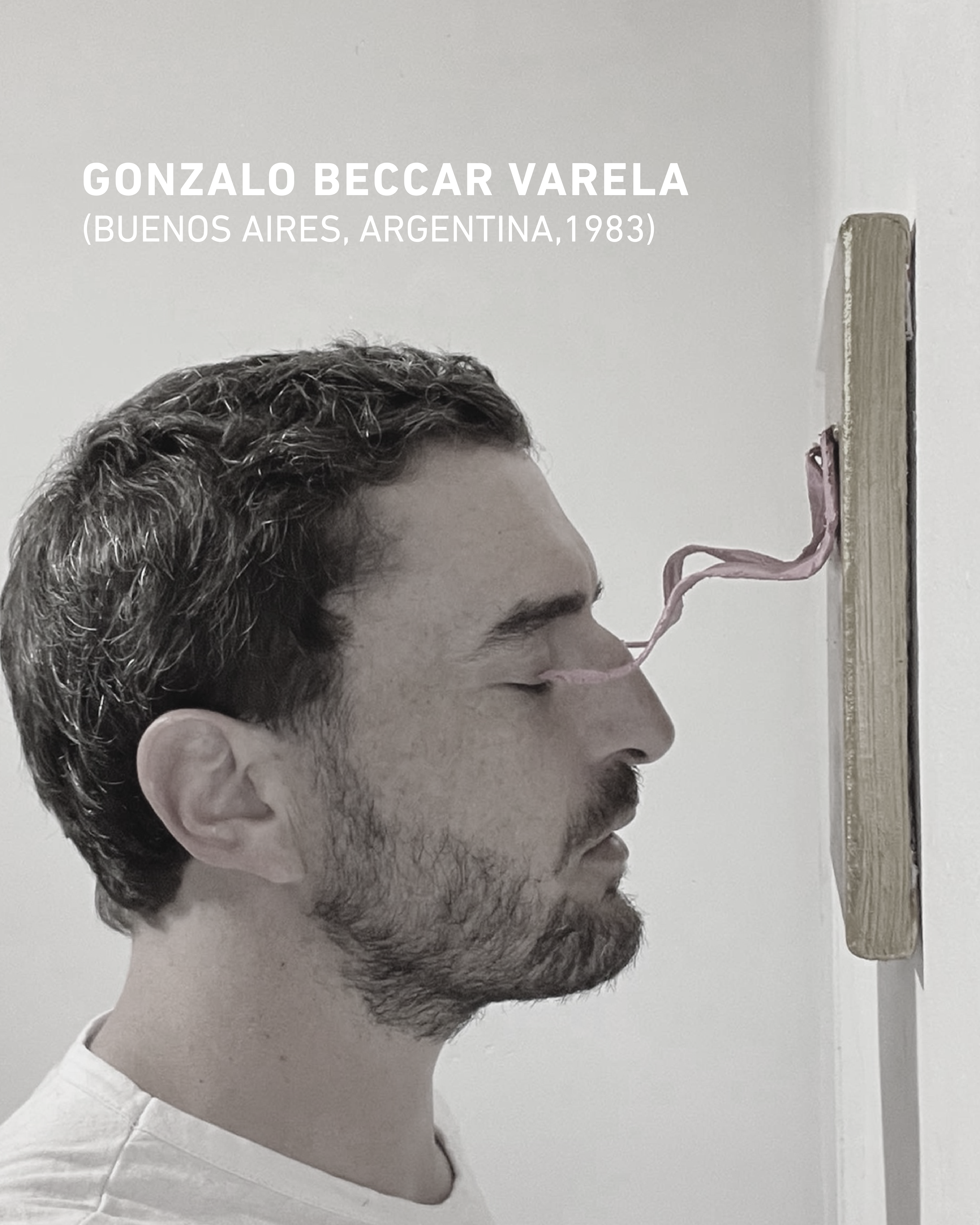 Una pintura para escuchar, una pintura radical, histriónica, tímida; una pintura incomprendida, iridiscente, irreverente; una pintura amarilla tomandorojo, una pinturasanta para toda plegaria. Una pintura con sed de más. Y entonces desarma y ensambla con su marco una columna vertebral. Un soporte cimiento que vuelve el bastidor exoesqueleto; un pigmento, temperamento. Metamorfosis antropoide, descansa su poderío corpóreo en la fragilidad autoportante. Espejo distorsionado de su propia voluntad, las obras de Gonzalo Beccar Varela denotan el intrincado vinculo que las une, anhelando que su contemplación revele, sin develar, sus encuentros de taller.